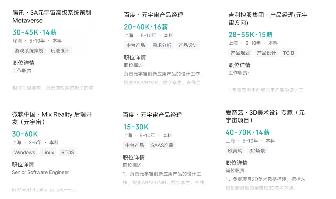 在某招聘类APP中搜索“元宇宙”会看到有大量的高薪岗位,涉及的企业有腾讯、百度、爱奇艺、吉利、微软中国等等。