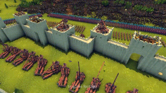 游戏的物理表现可谓十分爽快逼真,投石车其强大的威力将敌人攻击潮炸出了“水花”,而单位 AI 受击反馈仅是物理表现的一个点,如玩家制造的每门炮都具有一定的射程,而中世纪的炮弹都是以弧线形式投射的;箭矢无法射穿墙壁,相反它们会被墙壁弹开;城楼上的弓箭手有视野盲区,因此紧锁的城门不仅对敌人来说是个障碍,对玩家的部队也是。此外玩家在游戏中还可能会发现一些有关事情本质的有趣事实,而这些事实都将对游戏中的战斗产生积极影响。