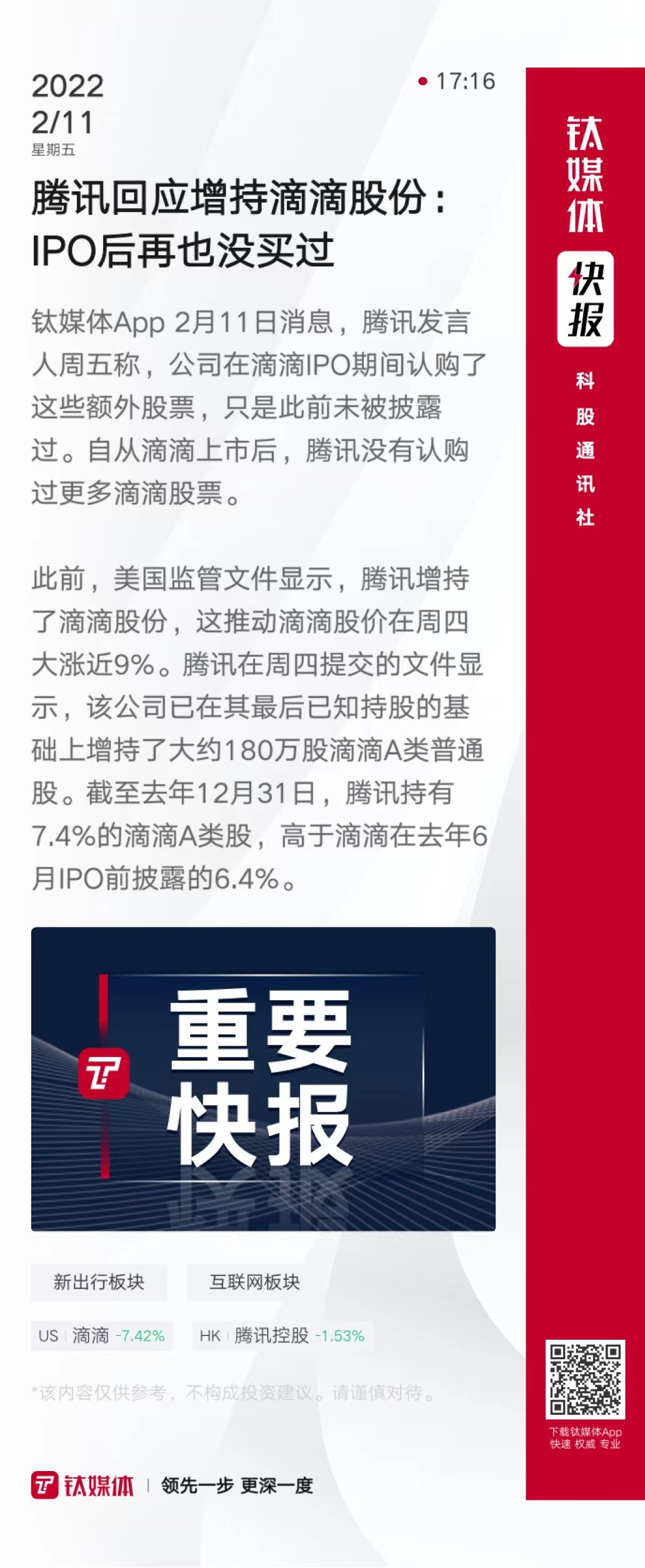 腾讯回应增持滴滴股份:IPO后再也没买过