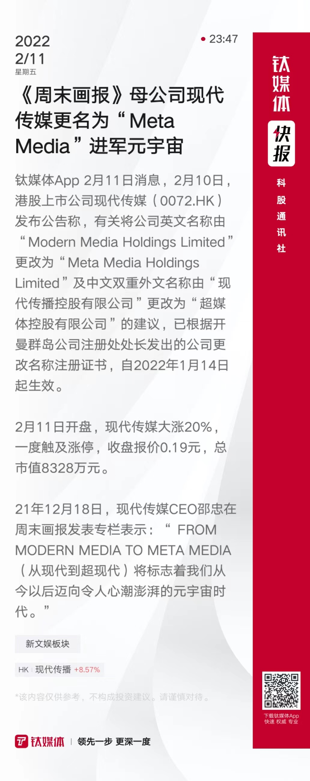 《周末画报》母公司现代传媒更名为“Meta Media”进军元宇宙