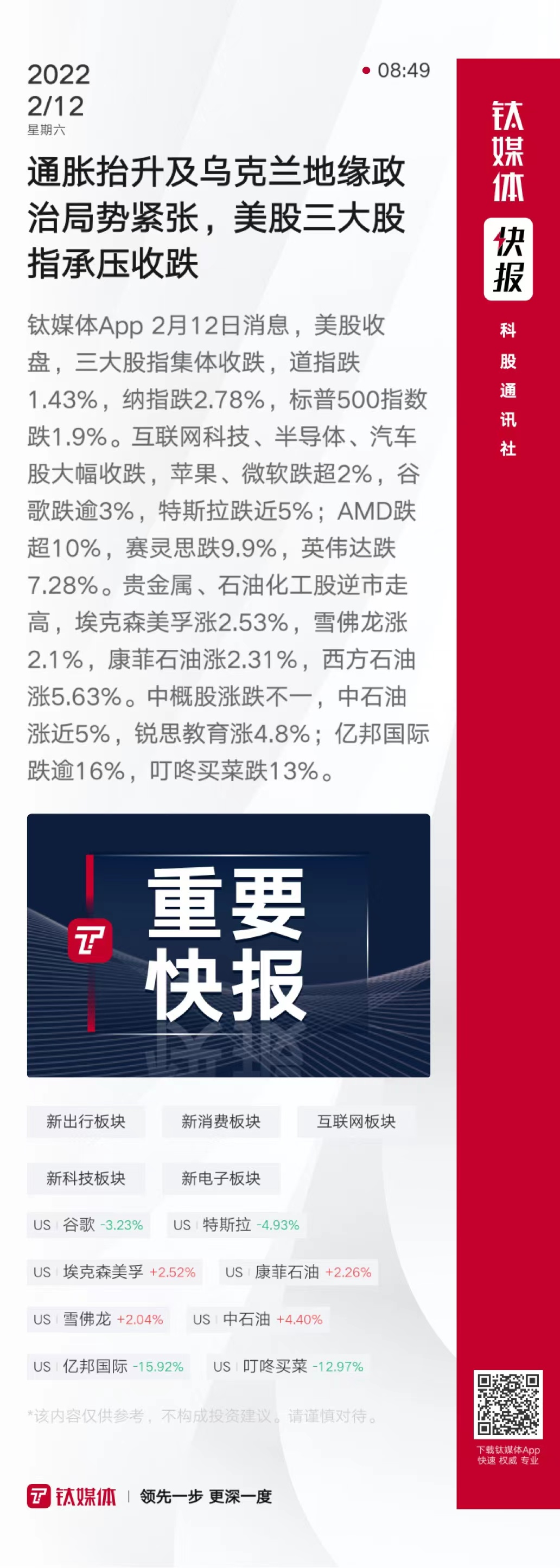 通胀抬升及乌克兰地缘政治局势紧张,美股三大股指承压收跌