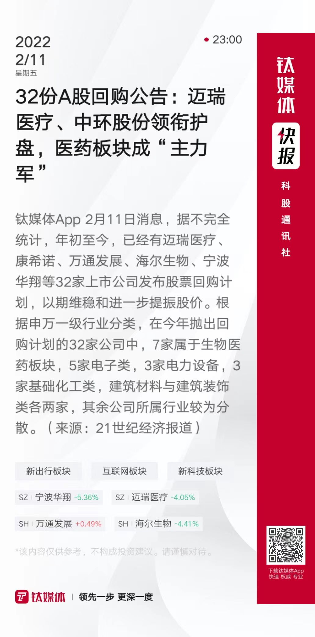 32份A股回购公告:迈瑞医疗、中环股份领衔护盘,医药板块成“主力军”