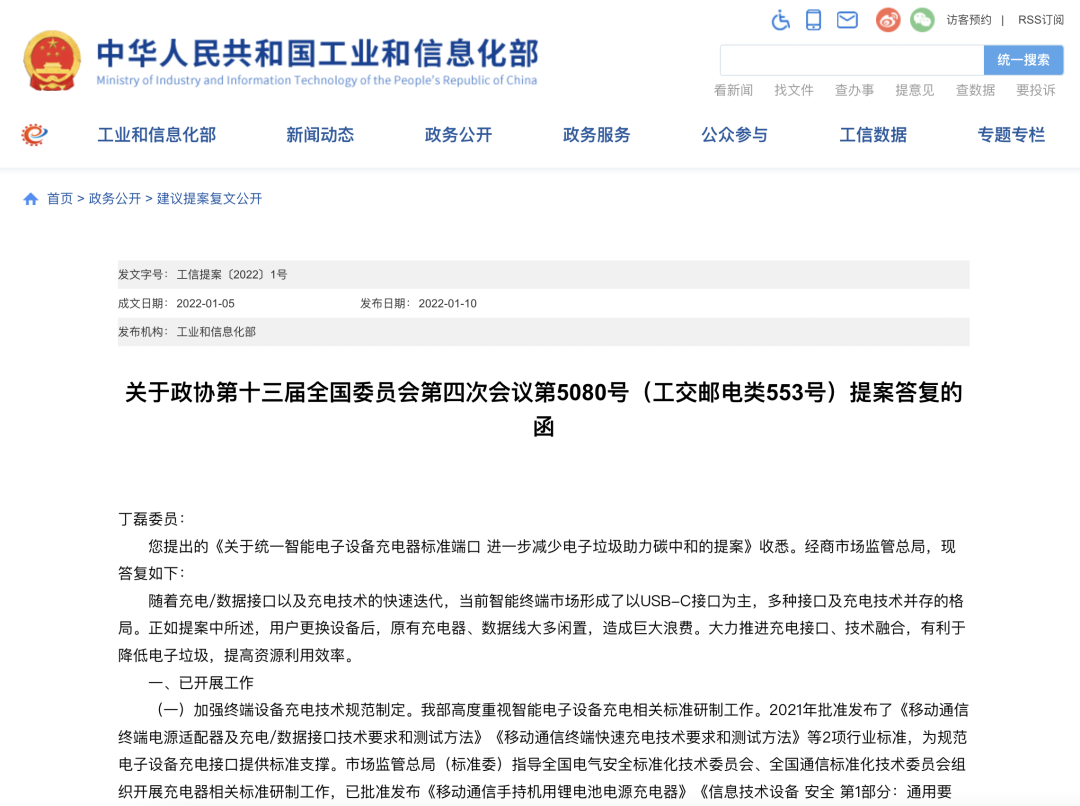 而就在那少部分还没有完全采用USB-C接口的厂商中,著名科技大厂苹果就是其中之一。近两年苹果的产品序列中,还有几款产品依旧采用的是自家的雷电接口,比如说iPhone、2021款iPad等,而也是因此这些产品也受到了不少用户的诟病,全球有非常多的用户都希望苹果能将iPhone更换为USB-C接口,而且也不仅限于民间,去年年底欧盟就曾提出了议案要求手机厂商将接口统一为USB-C。而在国内,在之前全国政协委员丁磊曾向工信部荐言,统一智能电子设备充电器标准端口,进一步减少电子垃圾助力碳中和。而就在近日工信部在官网发布了《关于政协第十三届全国委员会第四次会议第5080号(工交邮电类553号)提案答复的函》,针对丁磊的建议做出了明确的回复。工信部在文件中表示,随着充电/数据接口以及充电技术的快速迭代,当前智能终端市场形成了以USB-C接口为主,多种接口及充电技术并存的格局。用户更换设备后,原有充电器、数据线大多闲置,造成巨大浪费。大力推进充电接口、技术融合,有利于降低电子垃圾,提高资源利用效率。同时,工信部也表示目前已经从加强终端设备充电技术规范制定、促进各项快速充电技术融合互通、推动废弃电器电子回收利用工作三个方面开展工作,并分享了下一步工作路线:将继续推进相关国家标准制定,促进充电接口及技术融合统一,提高电器电子产品回收利用率,着力推动消费电子产业高质量发展。![]()