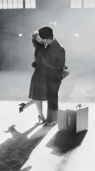 该幅摄影作品拍摄于1944年12月28日。作品中的两个人是处于热恋中的士兵戈登·基斯特和他的爱人玛丽·雷·宾厄姆,两人在洒满阳光的底特律中央火车站,依依不舍地拥吻。