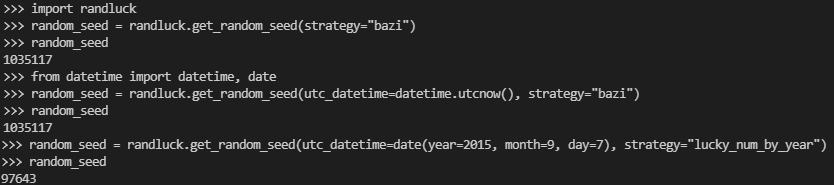 from datetime import dateime, daterandom_seed = randluck.get_random_seed(utc_datetime=datetime.utcnow(), strategy="bazi")print(random_seed)