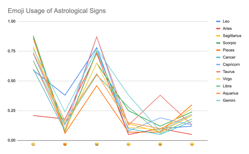 当然,AI作妖这么浪漫的点子,不会仅限于中国码农。用AI写星盘的点子,美国码农也有过。2017年,VICE杂志就有报道过,三个兼具码力、产品开发力、和星座学爱好的纽约码农,苦于当时市面上的「智能星盘」、「自动星盘」app只会复读录入的苏珊米勒们1990年代的作品,自己做了个「星盘算法」。基本机制倒不复杂。开发者首先录入各种天体运动在星相学上的对应算命阐释,同时开发接口自动扒来NASA公开的天体追踪数据。然后开发算法将这些数据的计算结果对应起来,同时开发自然语言生成器,让算法结果以「你的每日星盘」文章出现。这些星座学爱好者还有非常合格的产品经理能力,「星盘算法」app特别强调加好友的社交功能。不仅可以对照各人的星盘表,还能生成各人之间的星相契合性。各种天体与十二黄道星座互动的「入宫」,对各人和各人好友的命运影响和互动,在app上也有呈现。加的好友越多,呈现的结果就越具体。「星盘算法」的开发者很开心地对VICE说:「我们当然知道这不是科学算命。但这是一种有趣的故事阐述方式,既基于古神话学、又基于当代人性格,很好玩的。」不过不仅浪漫是普世的,理科生靠实力单身的性格好像也是普世的。2020年就有码农去推特上采样星盘推特回复的表情图频率作为原始数据,写了个项目来跑统计。以回复者的准确与否表态,来验证星座学是否真能有效算命……废话,当然不能了,真是不解风情,做这个项目的人一定不会有女朋友。参考资料: