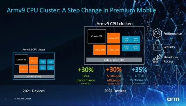 剩下的就只有从“底层”杜绝这个情况,用硬件生态来进行“管控”。比如高通、联发科于去年年底发布的骁龙8 Gen 1和天玑9000,除了具有非常强劲的性能提升这个大众可以“感知”的部分:整个框架升级到了ARM最新一代Cortex-X2超大核、Cortex-A710大核和Cortex-A510小核架构外,最大变化是更为底层的“提升”,即指令集就采用了ARM V9。