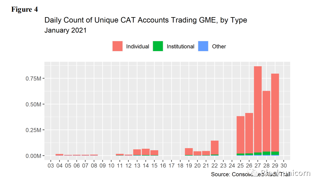 GameStop挤压的主要驱动因素之一是大量购买看涨期权,这导致做市商通过购买标的股票来对冲看涨期权的持有,从而推高了股价。虽然工作人员确实发现个人客户的 GME 期权交易量大幅增加,从 1 月 21 日的 5850 万美元增加到 1 月 22 日的 5.634 亿美元,直到 1 月 27 日达到峰值 24 亿美元,但期权交易量的增长主要是由购买看跌期权,而不是看涨期权。此外,数据显示,做市商是在买入而不是卖出看涨期权,这些观察本身与GameStop挤压不一致。