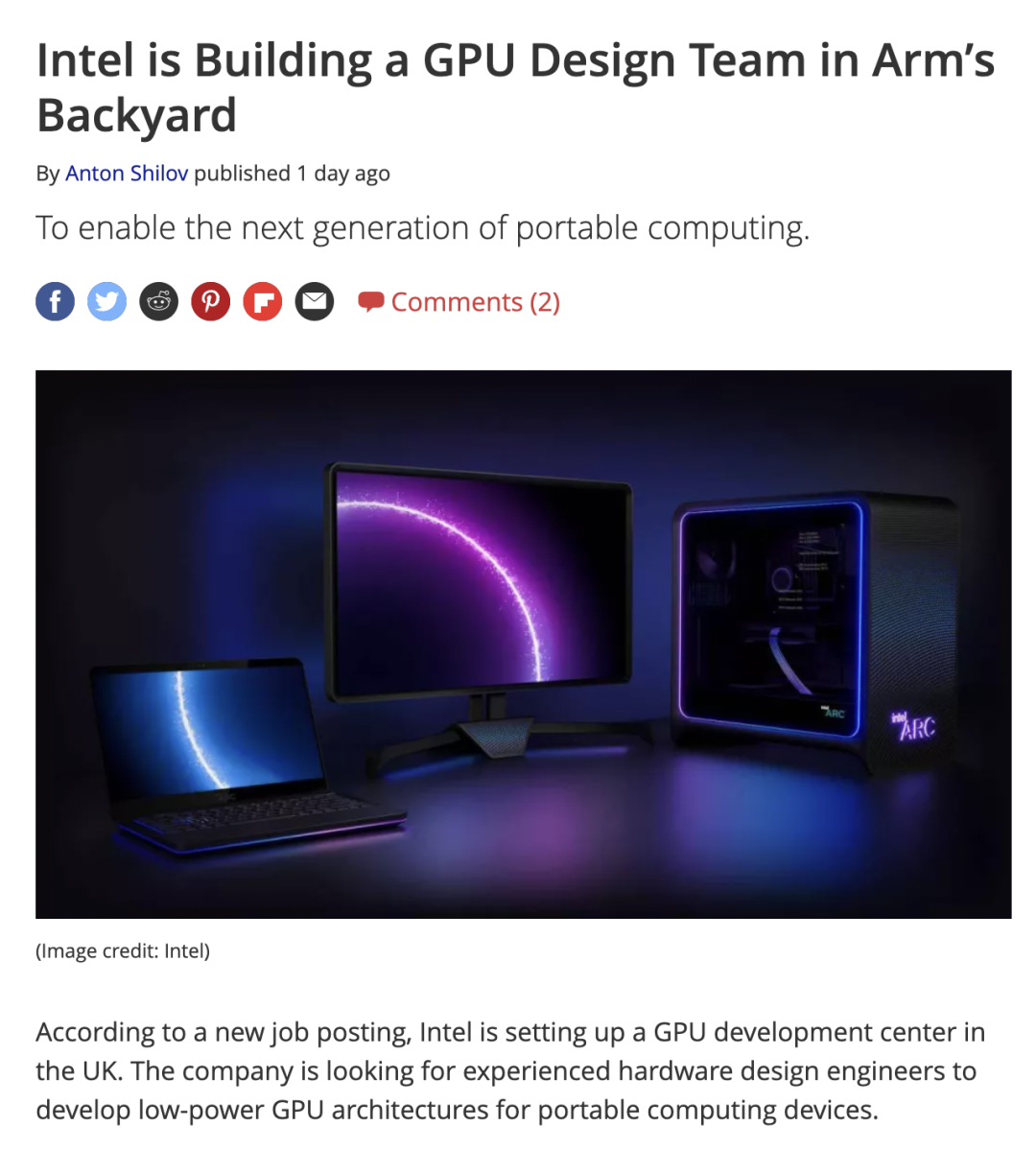而就在近日,英特尔的新一代至强Sapphire Rapids中的48核产品就在网上被曝光了出来,根据爆料图,其AIDA64识别信息包括基于Intel 7(10nm)工艺制造、Socket E (LGA-4677)接口、三级缓存90MB,270W功耗、支持AVX-512指令集等。其基础频率2.3GHz,加速频率3.3GHz。此外其跑分成绩也被曝光,对比的是是Zen3 3D缓存版Milan-X,EPYC 7773X处理器,以及Ice Lake-SP架构的至强铂金8380处理器。在Cinebench R15测试中,Sapphire Rapids依然保持了单核优势,对EPYC 7773X大概领先在26%左右,不过在多核跑分方面由于EPYC 7773X有64核128线程的优势,所以分数有一定落后。而在内存和处理器缓存延迟方面,英特尔两代平台表现都很不错,不过处理器缓存方面,3D缓存加持的Milan-X则有着巨大的优势。此外据外媒tom’s hardware报道,近期英特尔发布了一份新的招聘启事,计划在英国建立GPU开发中心。该公司正在寻找经验丰富的硬件设计工程师,为笔记本这类设备设备开发低功耗GPU架构。“我们正在英国建立一个全新的团队,只专注于一流的低功耗GPU架构和设计,以实现下一代的便携式计算,”英特尔的Xe架构和IP工程(XAE)低功耗组发布的职位描述中写道,“这需要在架构、硬件设计、软件驱动设计等一系列工程学科中具备成熟的技能,并以低功耗为关键重点。”目前,在英国有两个主要的GPU开发商——ARM的Mali开发团队和Imagination Technologies的PowerVR开发团队。两者都专注于低功耗的GPU架构,在设计苹果、联发科、恩智浦、三星和瑞萨等公司使用的节能GPU模块方面拥有丰富的经验。因此,可以说英特尔这次是在ARM家的后院里组建了个低功耗GPU开发团队,想要挖人那可是方便得很。![]()