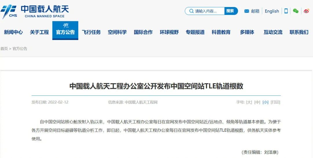 中国空间站即日起公布 TLE 轨道根数 便于各方开展空间目标避碰等
