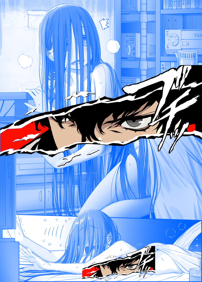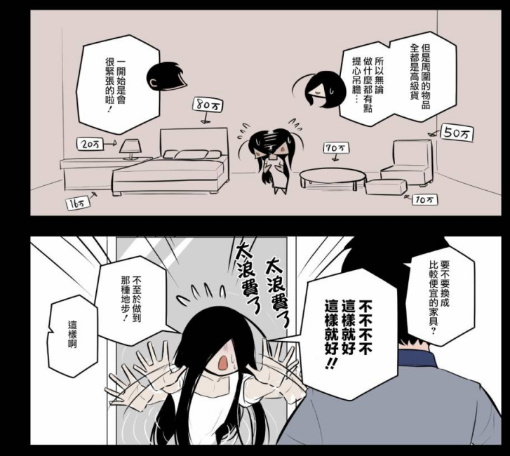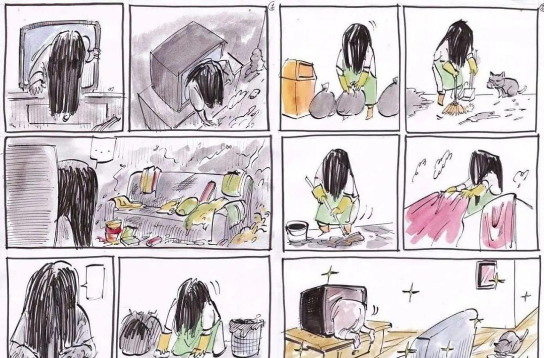 还有的作品,加入了贞子的个人情感,为漫画赋予了一个具体的故事场景,完成了一次小小的叙事。原本准备咒杀可恶的人类的贞子,穿过屏幕后却来到了一个无人的杂乱房间,这个房间脏乱差到连女鬼都看不下去,于是贞子挽起袖子将房间打扫得一尘不染,可谓如女仆一般贴心。