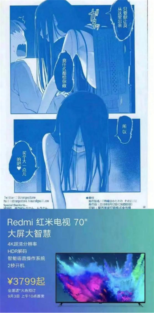 比村奇石后续在《星期一的丰满》中对贞子篇进行了续写,其发展也与这支广告有着某种程度上的相似之处。在贞子通过直播赚钱买到8K大电视以后,男主就跟她过上了日以继夜的操劳生活。