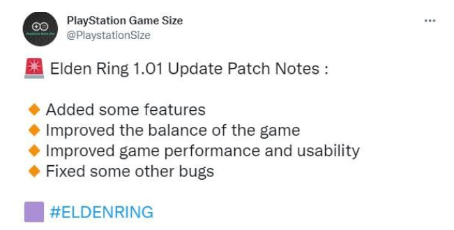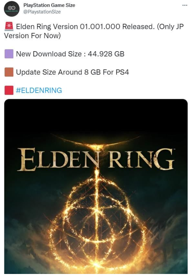 著名爆料党“Play Station Game Size”日前透露,日版《艾尔登法环》01.001.000版本已发布,PS5版《艾尔登法环》最新下载大小为44.928GB,PS4版更新大小8GB左右。