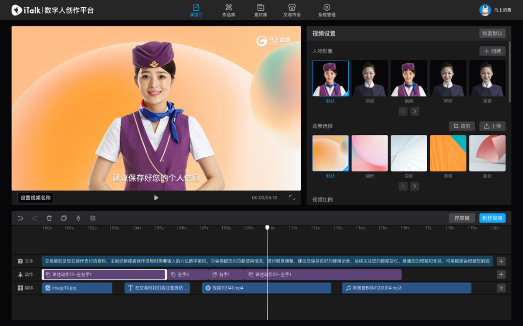 通过“iTalk数字人创作平台”提供友好的图形化配置操作界面,支持数字人播报内容自动智能生产的全生命周期。平台具有以下特色功能和亮点: