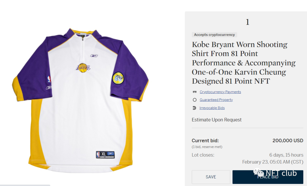 科比的投篮球衣将以实物形式出售,同时还配有科比81分比赛的NFT动画。这件球衣的起价为20万美元。苏富比将接受ETH、BTC、USDC以及法币的最终支付。