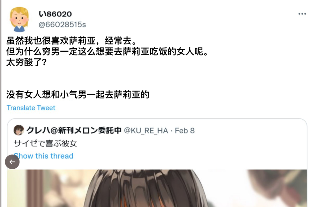 随着画作热度的攀升,部分日本网友,开始对“在萨莉亚约会”这件事挑起刺儿来。
