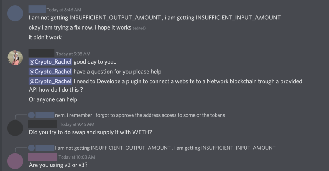 开发人员主要使用面向开发人员的聊天来讨论 Uniswap 协议功能的集成和解释,并从彼此那里获得帮助。问题以临时方式提出和回答,没有正式的指导方针。