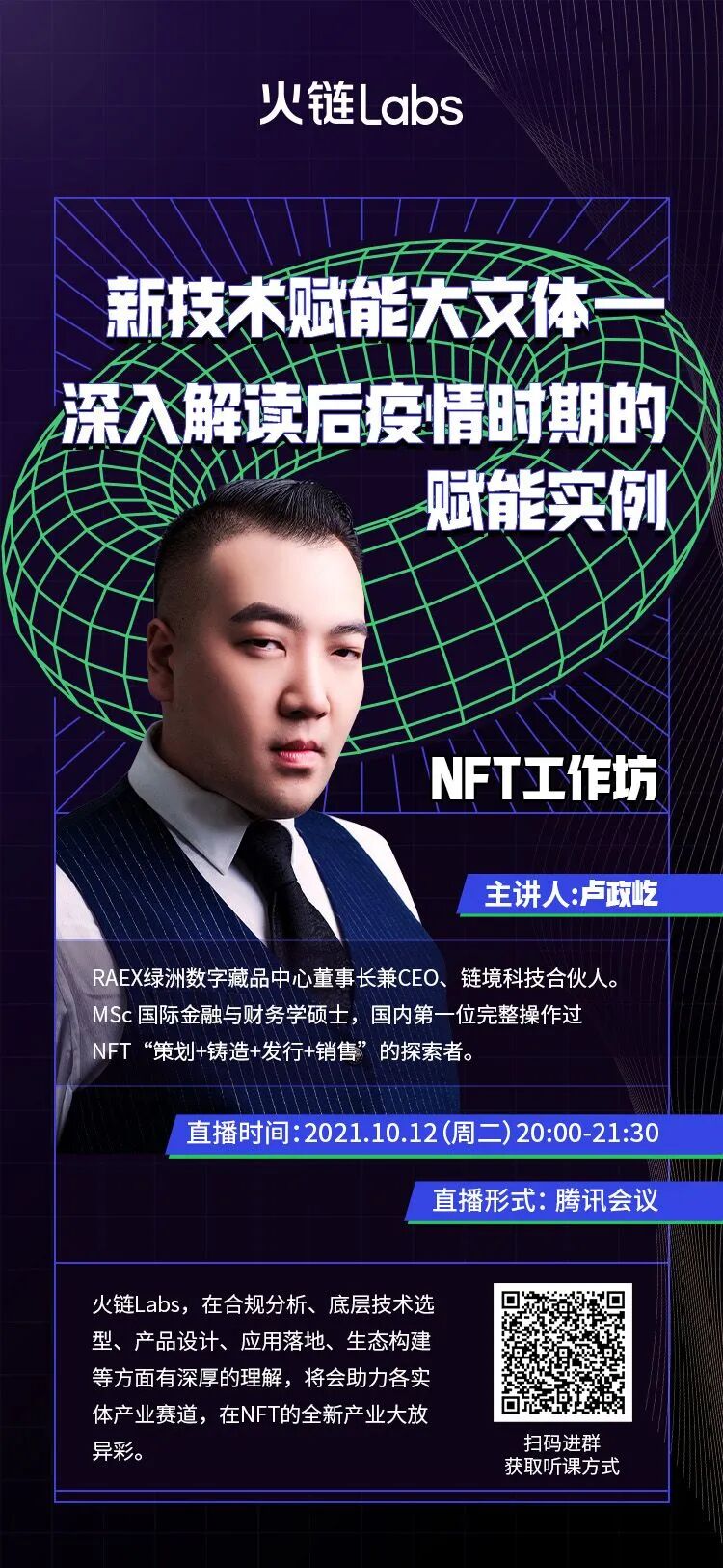 2021.10.12 (本周二) 20:00-21:30,RAEX绿洲数字藏品中心董事长兼CEO、链境科技合伙人卢政屹将带来主题为《新技术赋能大文体——深入解读后疫情时期的赋能实例》,敬请期待!