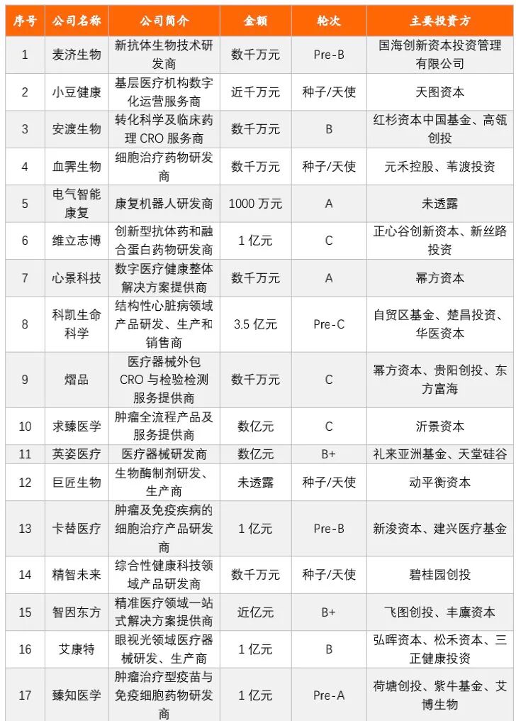 据零壹智库据零壹智库不完全统计,上周共有19家医疗科技企业获得融资,融资总额超过19.2亿人民币。其中,有9家企业获得了亿元级别融资,最高者为科凯生命科学,金额达3.5亿元人民币。
