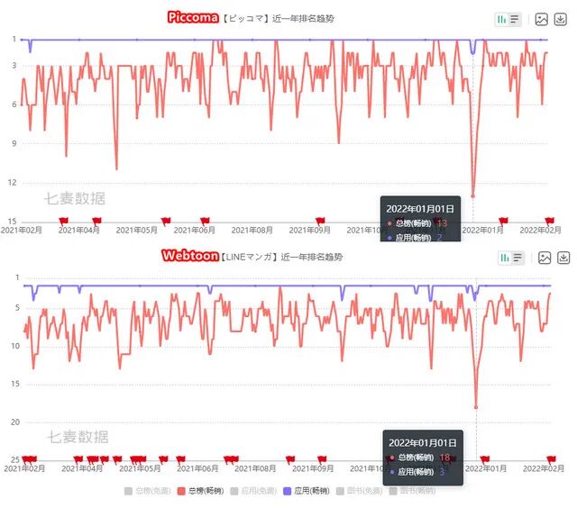 根据七麦的数据,2月22日当天,《Piccoma》和《Line漫画》这两大韩国网漫平台成功在日本App Store畅销总榜会师,分别位居二三位(第一依然是《智龙迷城》)。其中《Piccoma》在过去一年里甚至没有掉出过日本App Store畅销总榜的前13,而《Line漫画》同样也没掉出前18。