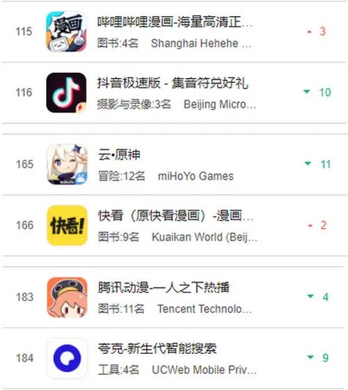 在韩国网漫平台红红火火的同一时间,GameLook也发现,国内的网漫平台却并没有活得那么滋润,远远落后于一大批应用和游戏。同样根据七麦的数据,在中国大陆App Store畅销总榜中,排名最前的平台是《哔哩哔哩漫画》,畅销榜排名115名,其次是快看漫画和腾讯动漫,二者的排名分别为166名和183名。