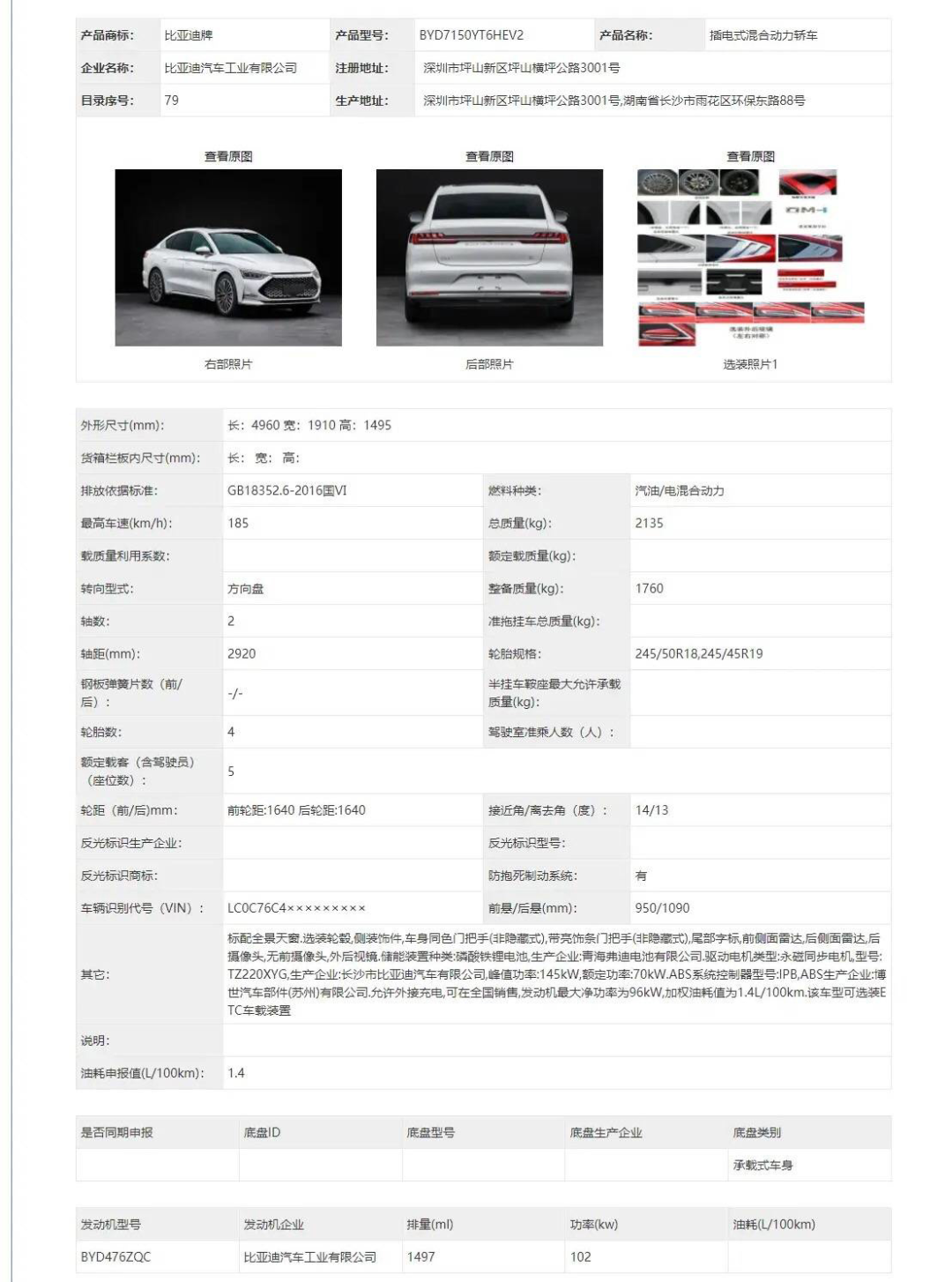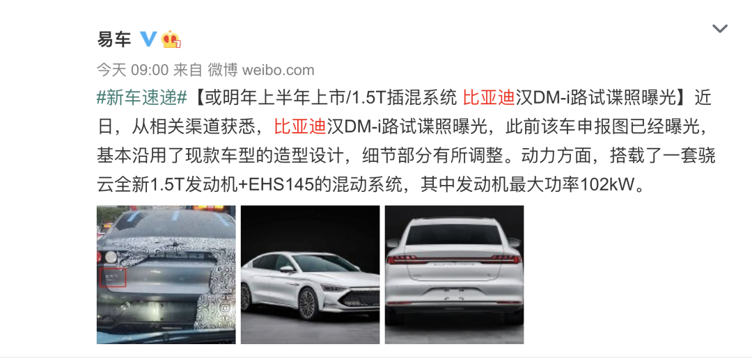 其中DM-i自今年推出以来,凭借着亏电油耗3.8L、百公里加速7.9s、综合续航超1000km的表现,彻底颠覆燃油车,销量更是一路高涨。而就在今天,易车爆料了一组比亚迪汉DM-i车型的路试谍照,根据谍照可以看到该车型整体风格与现款比亚迪汉十分相似,依旧采用贯穿式大灯,两侧的主光源运用了“龙爪”的元素,同时左下方的DM-i标识也阐明了这款车的身份,但很可惜右侧的汉字标识没有露出来。事实上比亚迪汉DM-i早在今年6月份就在工信部申报获批,动力系统采用了比亚迪全新的DM-i插电混动系统,相比现款汉DM(DM-p)而言更加经济。参考此前的申报图,新车外观设计将与现有的汉DM保持一致,继续采用Dragon Face设计语言打造,前脸部分拥有大尺寸多边形进气格栅,同时“汉”字车标镌刻于装饰条中间,车头的左右下角还拥有竖立状的空气导流槽,并延伸出一根尖锐的装饰条,贯穿式尾灯更是与汉EV几乎相同。尺寸方面,新车长宽高分别为4960/1910/1495mm,轴距达到了2920mm,定位为C级轿车,最大可配19英寸轮毂,并有多种样式的轮毂以及外观装饰件可选。相比现款汉DM 2.0T+后桥电机的组合,DM-i搭载了一套骁云全新1.5T发动机+EHS145的混动系统,这套系统在比亚迪唐DM-i车型中也有搭载。