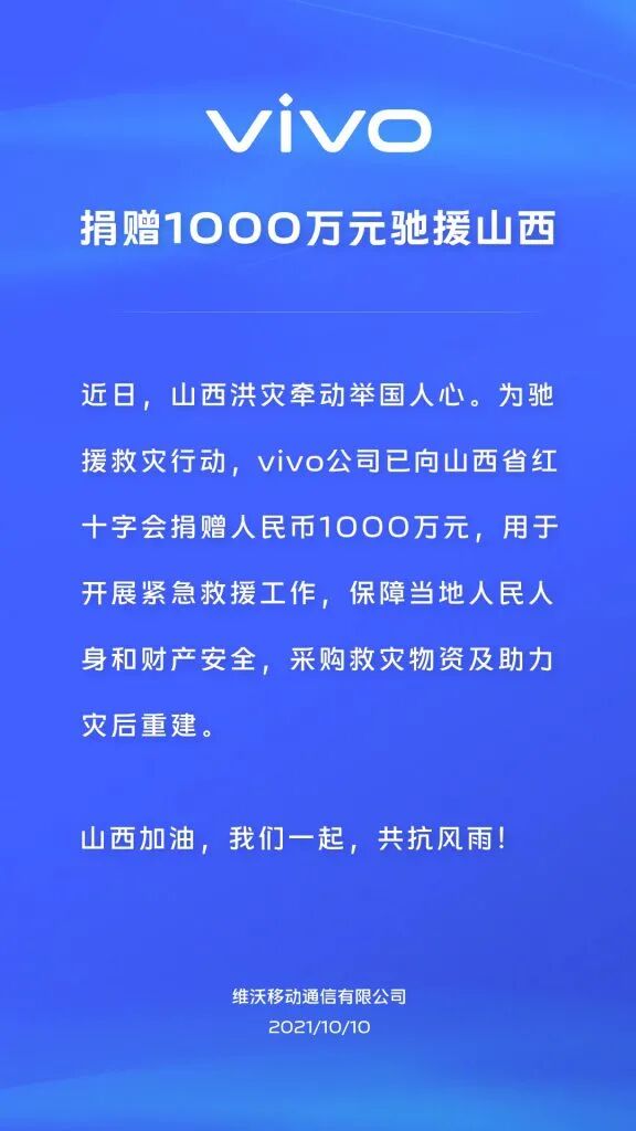 vivo捐赠1000万元紧急驰援山西。携手共晋,风雨同舟!