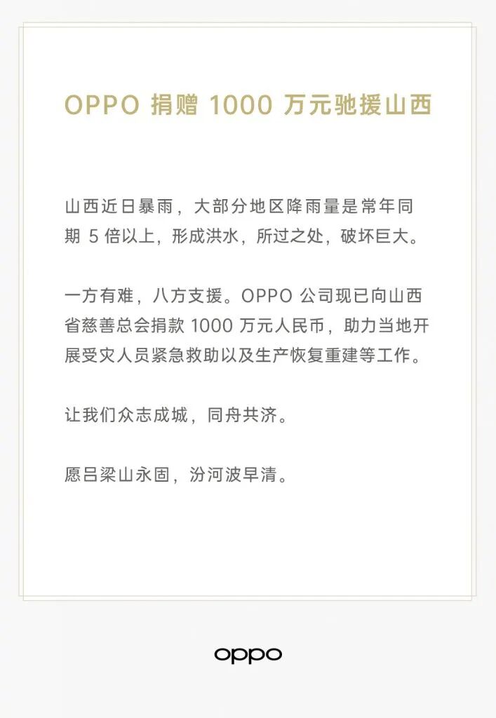 一方有难,八方支援,OPPO公司现已向山西省慈善总会捐款1000万元人民币,助力当地开展救灾工作。