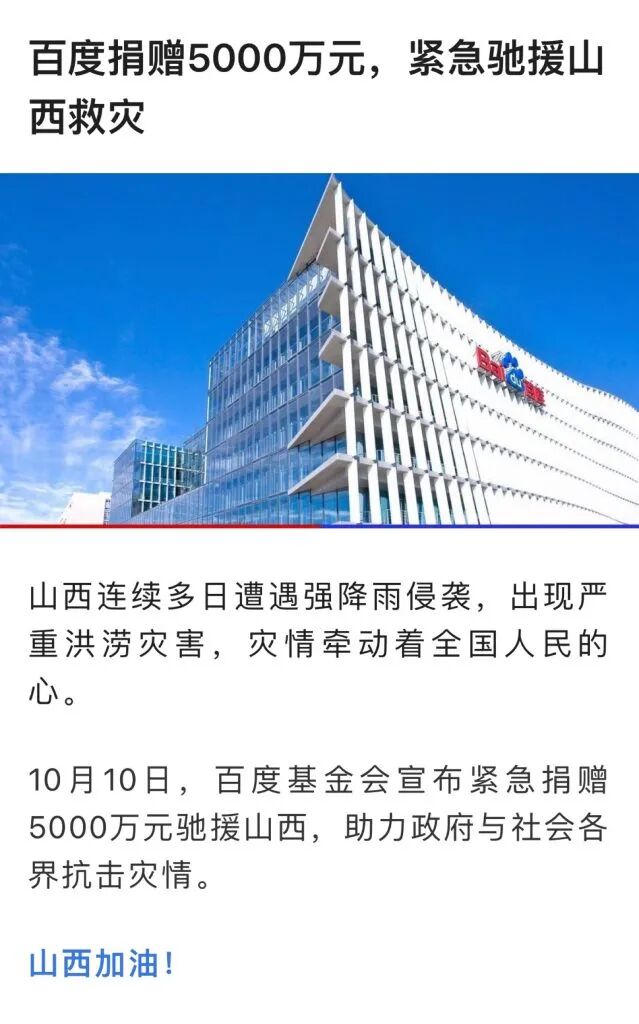10月10日,百度基金会宣布紧急捐赠5000万元驰援山西,助力政府与社会各界抗击灾情。