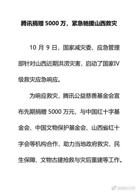 山西洪涝灾害严重,我们将先期捐赠5000万元,依照山西省政府统一指挥,助力抢险救灾、民生保障、灾后重建等工作。