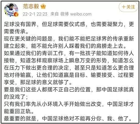 至于范志毅本人,也在国足输球的当晚,发了一条感慨性极强的微博。52岁的范大将军这一次并没有选择跟九年前一样在屏幕前对国足体系从上到下进行痛斥,而是用一通掏心窝子的话谈了谈足球的“传承”与足球本身的意义。
