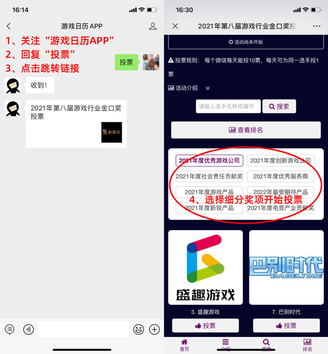 长按图中二维码关注“游戏日历APP”微信公众号,回复“投票”获取投票链接,点击链接跳转至投票页面,选择你想要投票的某一细分奖项,即可进行投票。投票截止日期为2021年12月10日。