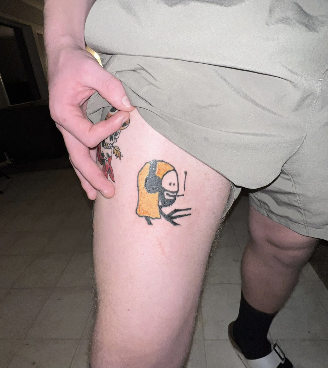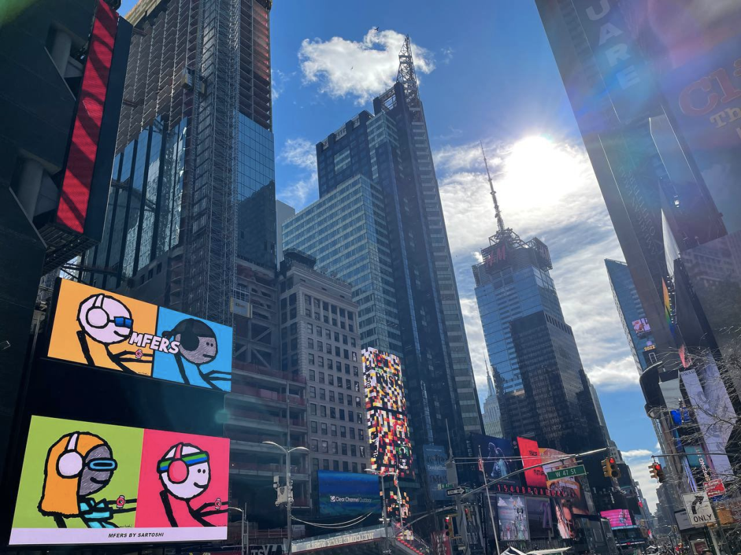 海外社群同样热闹,有人给 mfers 写歌,有人去时代广场拉广告,有人租下无人机把 mfers 带上了天,还有猛男把他的 mfers 纹到了大腿根,当然,最常见的还是满天飞的各种 web2 me vs web3 me 对比图。