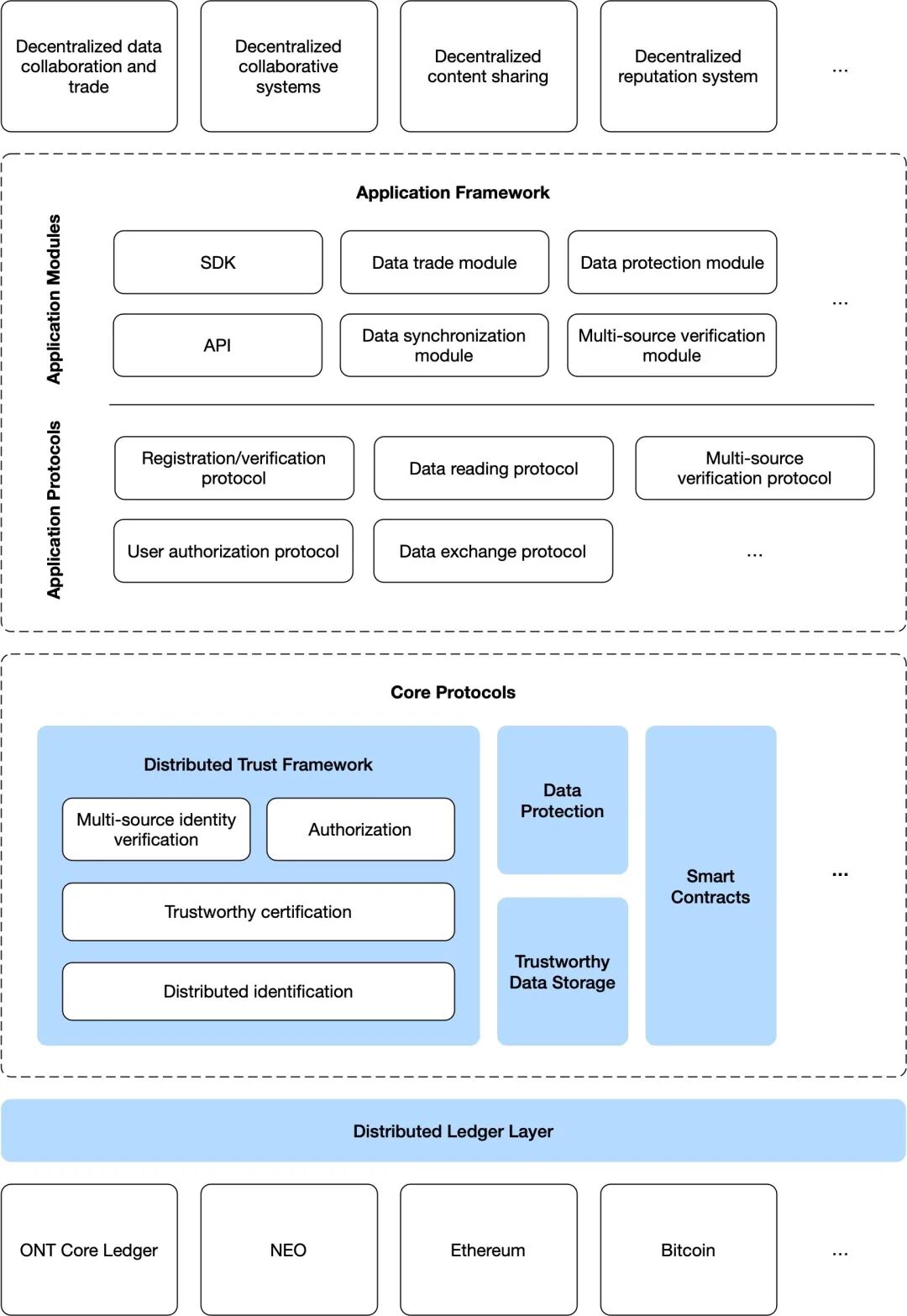 Ontology区块链分布式账本系统(DLT),包括核心分类账、智能合约系统和安全系统。分布式账本促进共识、数据保护、数据存储和智能合约应用程序框架。Ontology 的 DLT 也可以支持其他区块链、非区块链和其他传统信息系统。因此,Ontology也被称为“Ontology Chain Group”或“Ontology Chain Network”,因为它旨在充当区块链之间的互操作层。应用层允许开发人员使用Ontology的去中心化身份工具套件构建应用程序。
