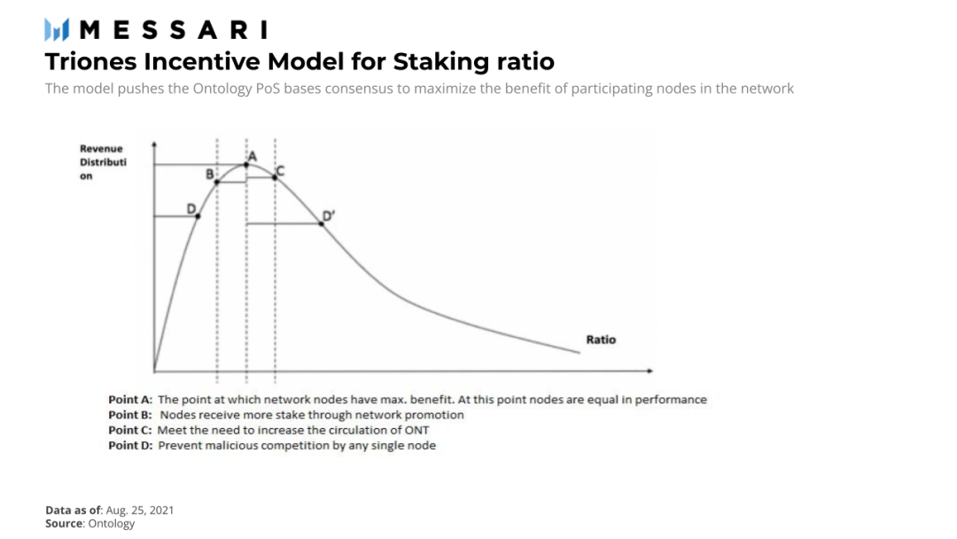Ontology 的双代币模型在共识网络和非共识网络之间平均分配质押收益。PoS 共识网络需要质押 ONT 才能根据质押比例获得 ONG。为了防止堆栈合并,Triones 共识系统根据节点成本和链上业务规模动态调整候选网络规模。候选网络由满足性能要求参与共识的节点组成。节点成本包括硬件成本和放弃 ONT 流动性进行质押的机会成本。业务规模是指链上业务活动,包括在Ontology区块链上的业务开发。