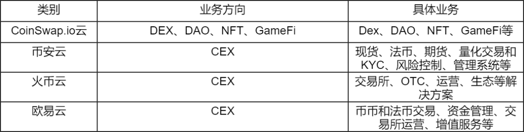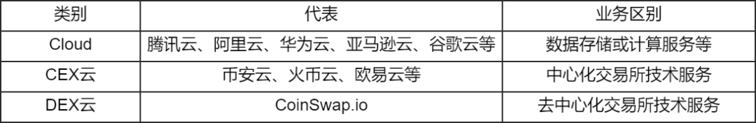 接下来,简单的介绍下主要CEX云和DEX云的主要解决方案的一些区别,如下表格: