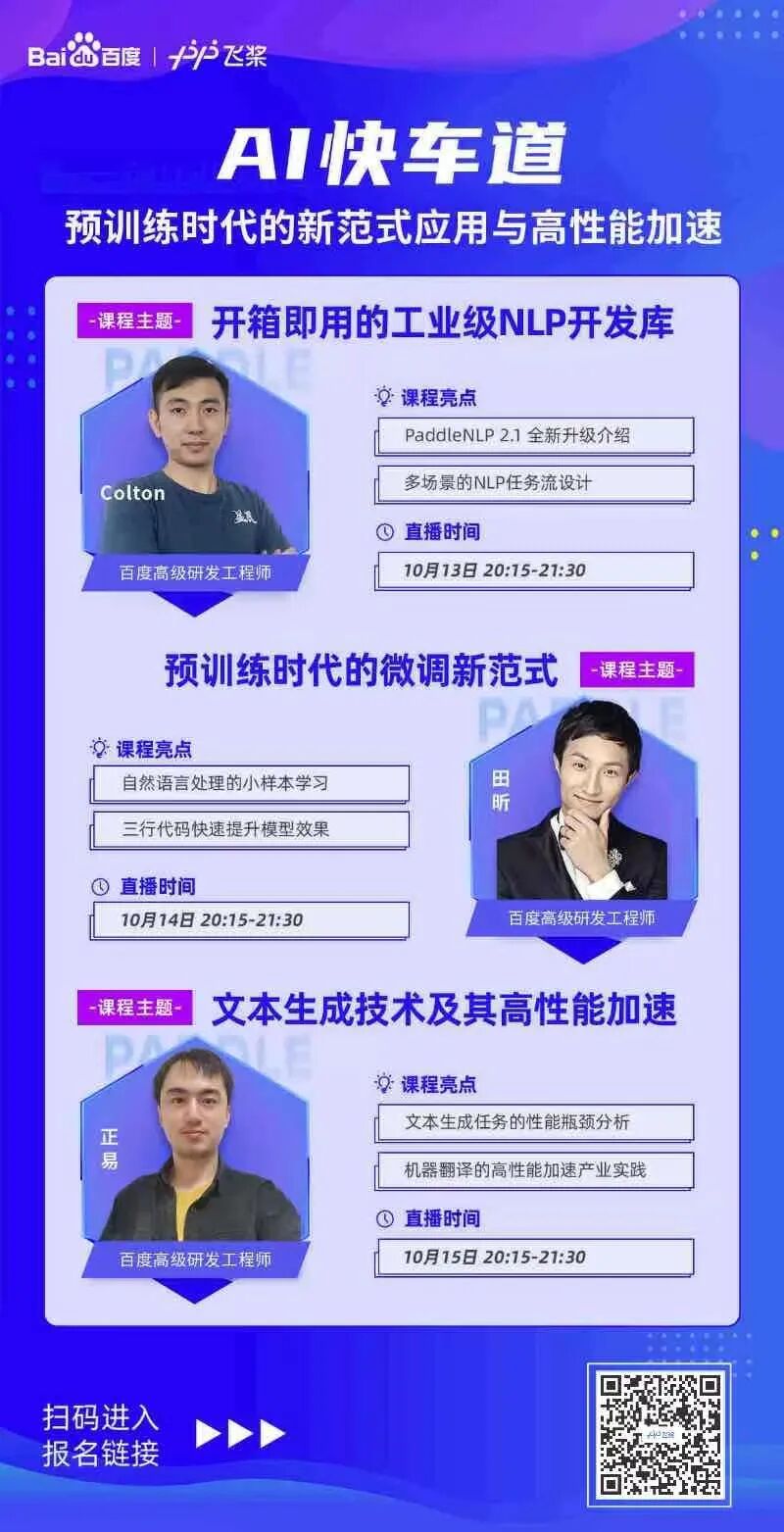 更多PaddleNLP加速使用文档可以参考:https://github.com/PaddlePaddle/PaddleNLP/blob/develop/docs/advanced_guide/fastertransformer.rst别的不需要多说了,大家访问GitHub点过star之后自己体验吧:https://github.com/PaddlePaddle/PaddleNLP除了重磅发版以外呢,我们还为大家精心准备了配套课程,在10月13-15日,连续三天PaddleNLP技术精讲课程,百度飞桨的明星讲师们历时一个月呕心沥血打磨的三日课,小伙伴们速度扫码报名,快速get PaddleNLP最新技能点!官网地址:https://www.paddlepaddle.org.cnGitHub: https://github.com/PaddlePaddle/PaddleNLPGitee: https://gitee.com/paddlepaddle/PaddleNLP[1]Entailment as Few-Shot Learner(https://arxiv.org/pdf/2104.14690.pdf)[2] Exploiting Cloze Questions for Few Shot Text Classification and Natural Language Inference(https://arxiv.org/pdf/2001.07676.pdf)(https://arxiv.org/pdf/2103.10385.pdf)[4]FewCLUE: A Chinese Few-shot Learning Evaluation Benchmark(https://arxiv.org/pdf/2107.07498.pdf)[5] https://github.com/NVIDIA/FasterTransformer[6] A Simple, Fast Diverse Decoding Algorithm for Neural Generation(https://arxiv.org/pdf/1611.08562.pdf)[7] Google’s Neural Machine Translation System: Bridging the Gap between Human and Machine Translation (https://arxiv.org/pdf/1609.08144.pdf)