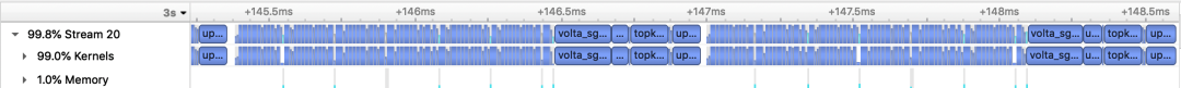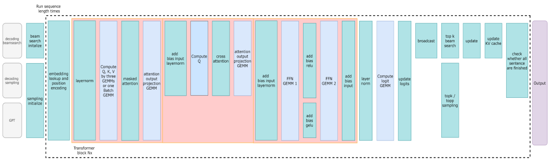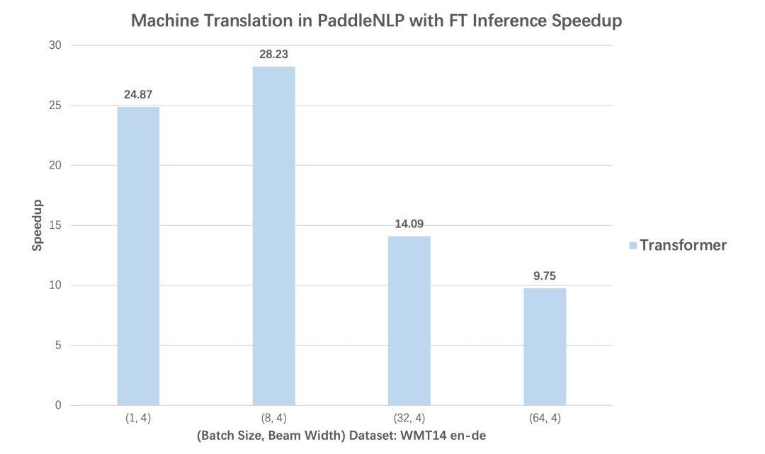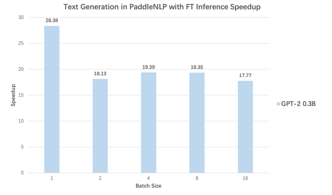 PaddleNLP与NVDIA强强联合,以FasterTransformer[5]为基础,提供了Faster系列的推理API,重点拓展了更多主流网络结构适配与解码策略支持。同时结合飞桨核心框架2.1版本全新的自定义OP的功能,提供了与飞桨框架无缝衔接的使用体验。FasterTransformer Decoding Workflow在Transformer机器翻译、GPT文本生成两个任务中,分别对比使用动态图版本的性能和内置Faster系列的推理API后,不同batch size下预测性能加速比,从对比数据可以看到无论Transformer还是GPT,均可得到高达28倍推理速度提升!PaddleNLP Transformer翻译模型加速优化前后的Nsight Profling对比图PaddleNLP v2.1提供工业界主流的解码加速支持,包括经典的Beam Search,以及多个Sampling-based的解码方式:如Diverse Sibling Search[6]、T2T版本的Beam Search实现[7]、Top-k/Top-p Sampling等。丰富的加速策略可以满足对话、翻译等工业场景的实际应用,同时PaddleNLP的加速实现也在百度内部经过了大规模互联网业务的真实考验。表1:PaddleNLP 2.1 支持加速的模型结构与解码策略![]()