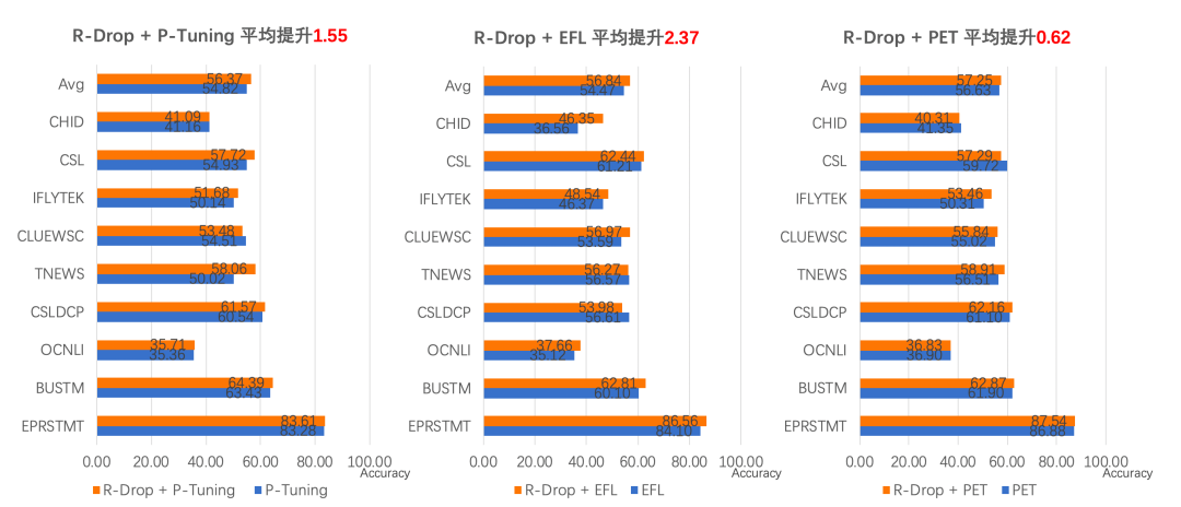 Few-Shot Learning(以下简称FSL)是机器学习的一个子领域。在仅有少数监督样本的情况下,训练得到强泛化能力的模型,实现对新数据的分类。结合最新的Prompt Tuning的思想,PaddleNLP中集成了三大前沿FSL算法: (1)EFL(Entailment as Few-Shot Learner)[1],将 NLP Fine-tune任务统一转换为二分类的文本蕴含任务。 (2)PET(Pattern-Exploiting Training)[2],通过人工构建模板,将分类任务转成完形填空任务。 (3)P-Tuning[3]:自动构建模板,将模版的构建转化为连续参数优化问题。使用小样本学习策略,仅仅32条样本即可在电商评论分类任务上取得87%的分类精度[4]。此外,PaddleNLP集成 R-Drop 策略作为 API,只需要增加三行代码即可在原任务上快速涨点,如图所示:https://github.com/PaddlePaddle/PaddleNLP/tree/develop/examples/few_shot- 3. 高性能预测加速:文本生成场景高达28倍加速效果