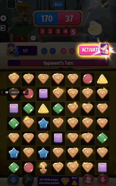 直观来看,《Match Masters》一改传统消除游戏模式,没有数不清的关卡、没有熟悉的地图, 也没有丰富的剧情故事。只有PvP对战玩法,即两位玩家在同一个三消游戏面板上,进行一对一的回合制战斗。