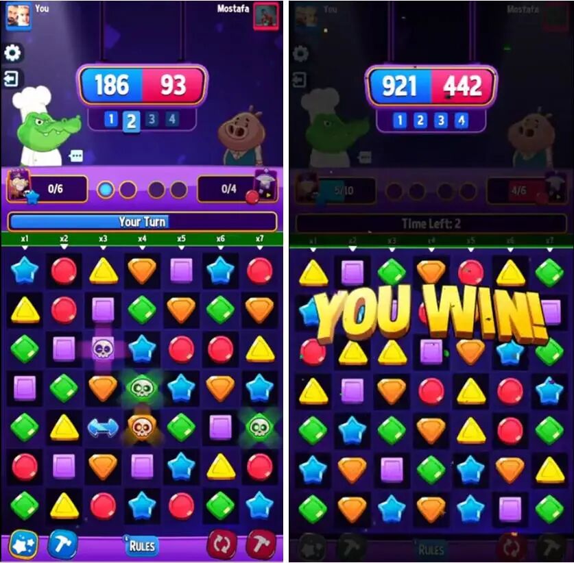 面对这一关键痛点,三消游戏更具融入实时PvP的优势。一方面,作为欧美手游市场最热门的品类之一,三消早已拥有规模较大泛用户群。另一方面,此类游戏类似回合制的玩法,不需要如FPS、MOBA般“手出法随”的反馈。不光对网速要求不高,更能兼容实时交互玩法,操作门槛低也易吸引泛用户的加入。