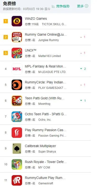 同样地,印度手游市场也不乏Teen Patti、Bingo、Rummy等特色玩法的产品,长期稳居当地棋牌类游戏下载榜前列。