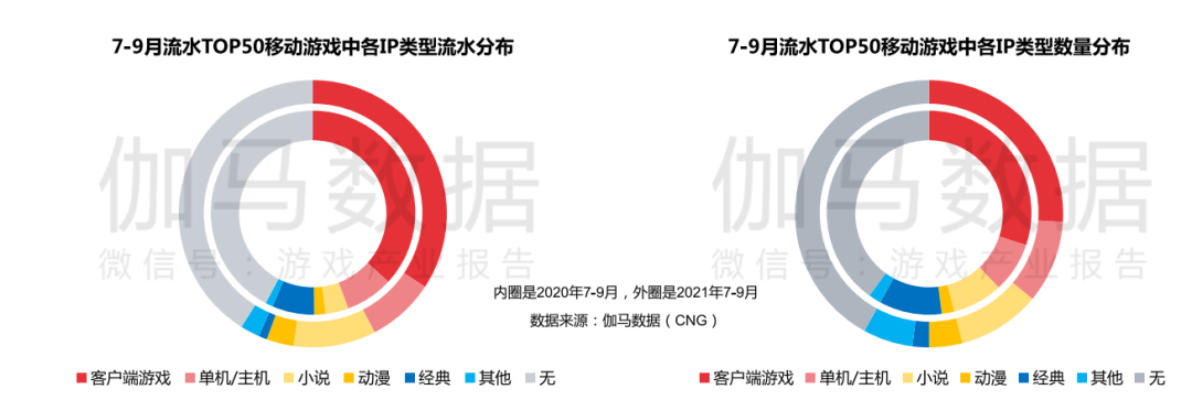 在流水TOP50游戏榜单中,射击类,MMORPG类,回合制RPG类,棋牌类,竞速类,消除类较去年同期份额均有所提升。此外,小说,动漫IP改编产品流水份额显著增长,而经典IP改编的产品流水份额程缩减的趋势。