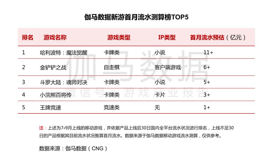 在7月-9月的新游中,网易的《哈利波特:魔法觉醒》连续8天霸榜iOS畅销榜,成为本季度第一款首月流水超10亿元的新品。紧随其后的是腾讯的自走棋《金铲铲之战》,以首月6亿元流水排名第二。值得一提的是,在新游首月流水TOP5榜单中,有三款游戏是卡牌类型。