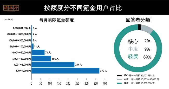 “轻度用户”数量最多,比例接近九成,普遍月消费在1万日元以下。当然进一步细看,会发现1万日元以下的用户,更多集中在月消费120日元到1000日元(约合人民币6.6~55元)之间。
