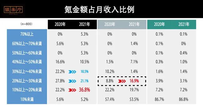 比如,2020年有22.2%的核心用户,会拿出每月收入的10~20%为游戏付费,到了2021年,这一数值上涨到了36.8%。先别高兴地太早,这部分数字的增长,其实是牺牲每月花20%~30%月收入,以及每月花30%~40%月收入用户的数量换来的。