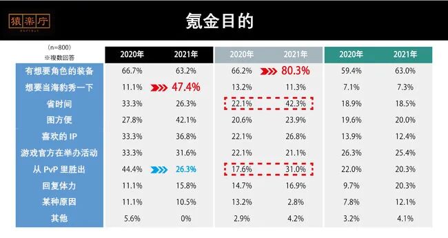 另一个较为反常的数据是,核心用户越来越不关心在PvP里取胜,相反中度用户的好胜心开始增强,有31%的中度用户是为了赢而氪金,而且中度用户还越来越重视效率,为省肝游戏时间而氪金的玩家,从2020年的22.1%翻倍涨到了2021年的42.3%。