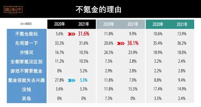 调查显示,日本玩家不氪金的主要原因有两点,一是不氪金也能玩,二是想要观一下,等游戏有人气,或觉得很有趣、运营不会跑路再氪金。