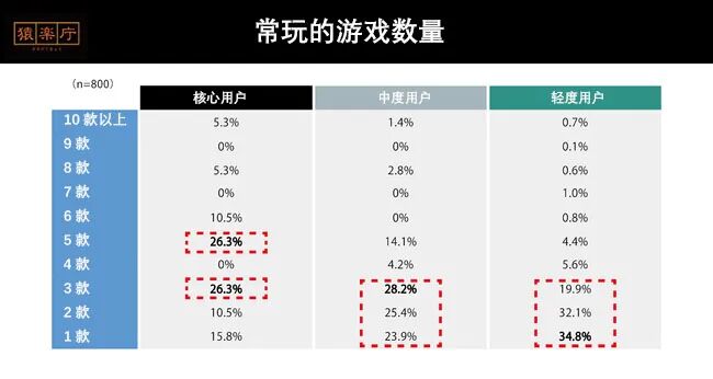 常玩游戏方面,日本玩家中只有硬核用户比较博爱,有26.3%常驻5款游戏。
