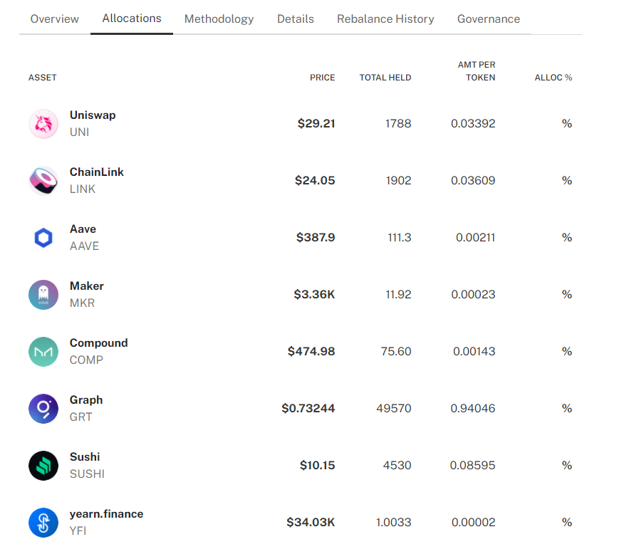 目前DFI的包含的代币及其每周回报率分别为:Sushi(28.46%)、AAVE(-10.09%)、Uniswap(-7.45%)、Chainlink(5.5%)、Maker(0.81%)、Yearn Finance(3.6%)、The Graph(-3.45%)、Compound(12.09%)